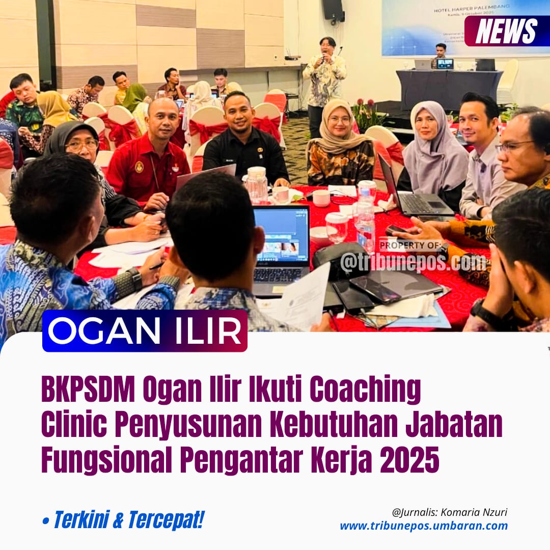 PALEMBANG, TRIBUNEPOS — Badan Kepegawaian dan Pengembangan Sumber Daya Manusia (BKPSDM) Kabupaten Ogan Ilir mengikuti kegiatan Coaching Clinic Penyusunan Kebutuhan Jabatan Fungsional Pengantar Kerja Tahun 2025 yang diselenggarakan oleh Kementerian Ketenagakerjaan Republik Indonesia, Kamis (9/10/25) di Hotel Harper Palembang.
