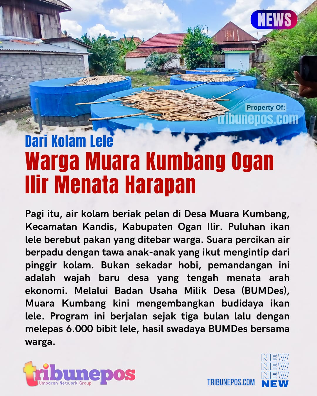 OGAN ILIR, TRIBUNEPOS — Pagi itu, air kolam beriak pelan di Desa Muara Kumbang, Kecamatan Kandis, Kabupaten Ogan Ilir, Sumsel. Puluhan ikan lele berebut pakan yang ditebar warga. Suara percikan air berpadu dengan tawa anak-anak yang ikut mengintip dari pinggir kolam.