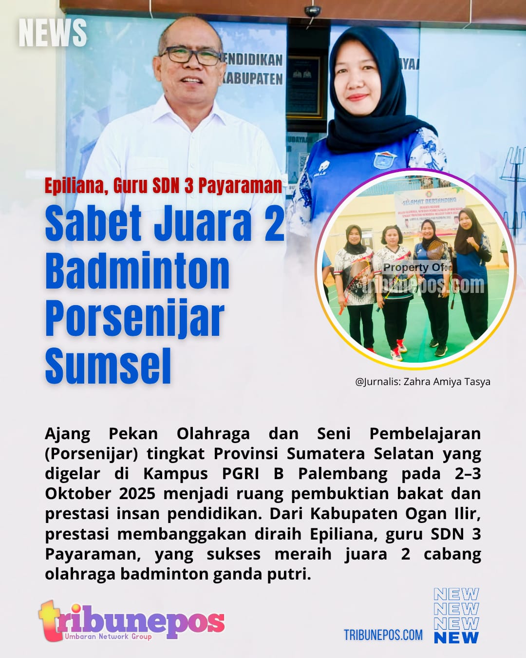 Dari Kabupaten Ogan Ilir, prestasi membanggakan diraih Epiliana, guru SDN 3 Payaraman, yang sukses meraih juara 2 cabang olahraga badminton ganda putri.