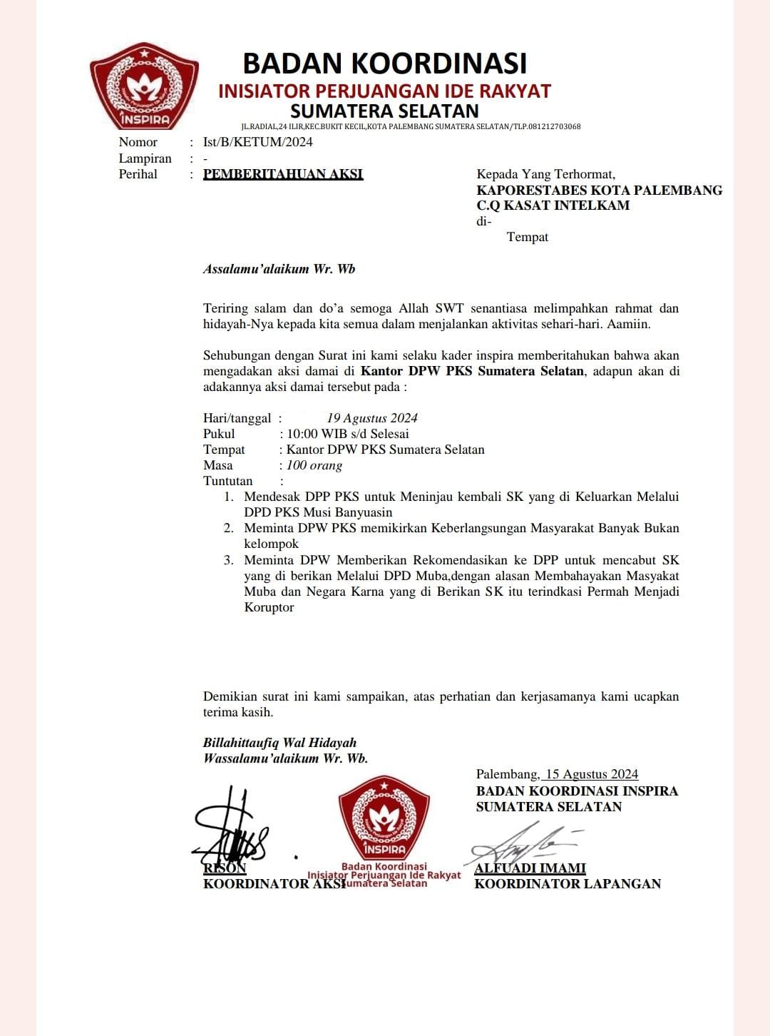 Koordinator aksi, Rison, dan koordinator lapangan, Alfuadi Imami, telah menandatangani surat pemberitahuan tersebut.