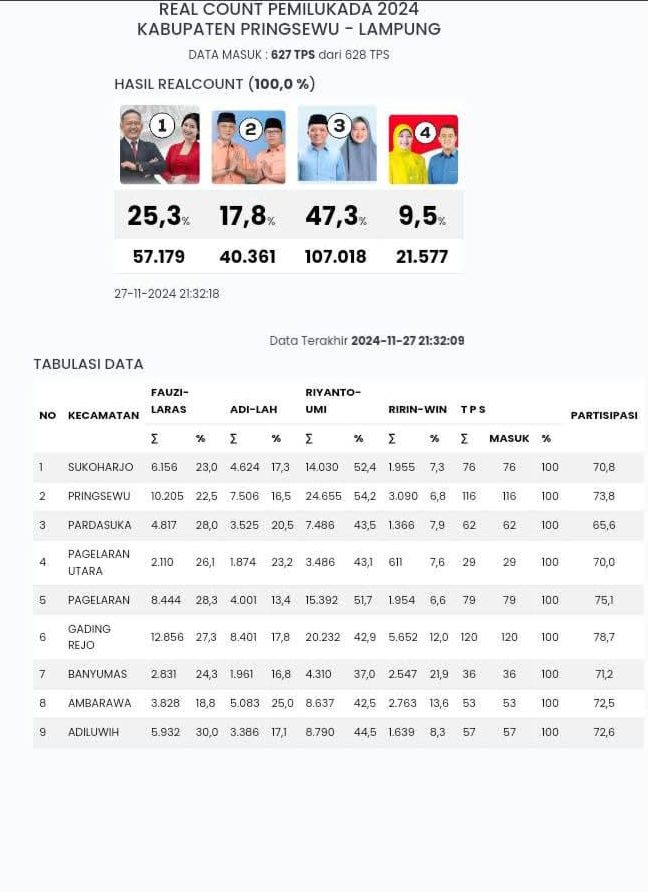 “Atas nama keluarga besar Ormas GRIB Jaya Kabupaten Pringsewu , kami mengucapkan selamat kepada Bapak H. Riyanto Pamungkas dan Ibu Umi Laila.S.Ag., yang berhasil meraih keunggulan dalam hasil hitung cepat Pilkada Kabupaten Pringsewu Provinsi lampung.