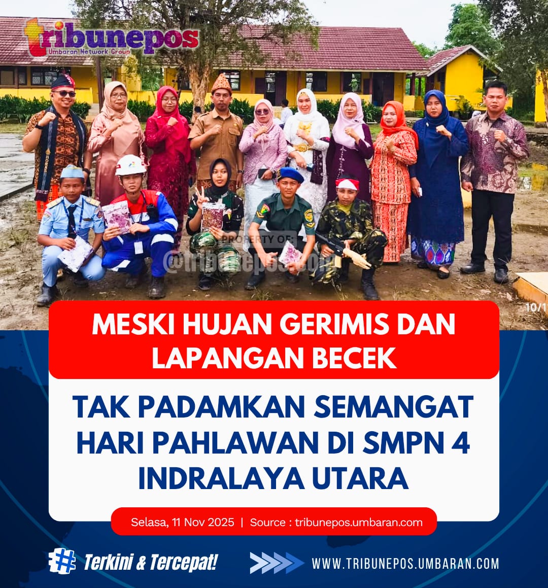 OGAN ILIR, TRIBUNEPOS – Suasana Desa Soak Batok, Senin (10/11/2025) pagi, berubah meriah dan khidmat. Ratusan siswa SMPN 4 Indralaya Utara bersama guru, tenaga administrasi, serta warga desa larut dalam peringatan Hari Pahlawan yang dikemas penuh semangat nasionalisme, meski gerimis turun membasahi lapangan upacara.