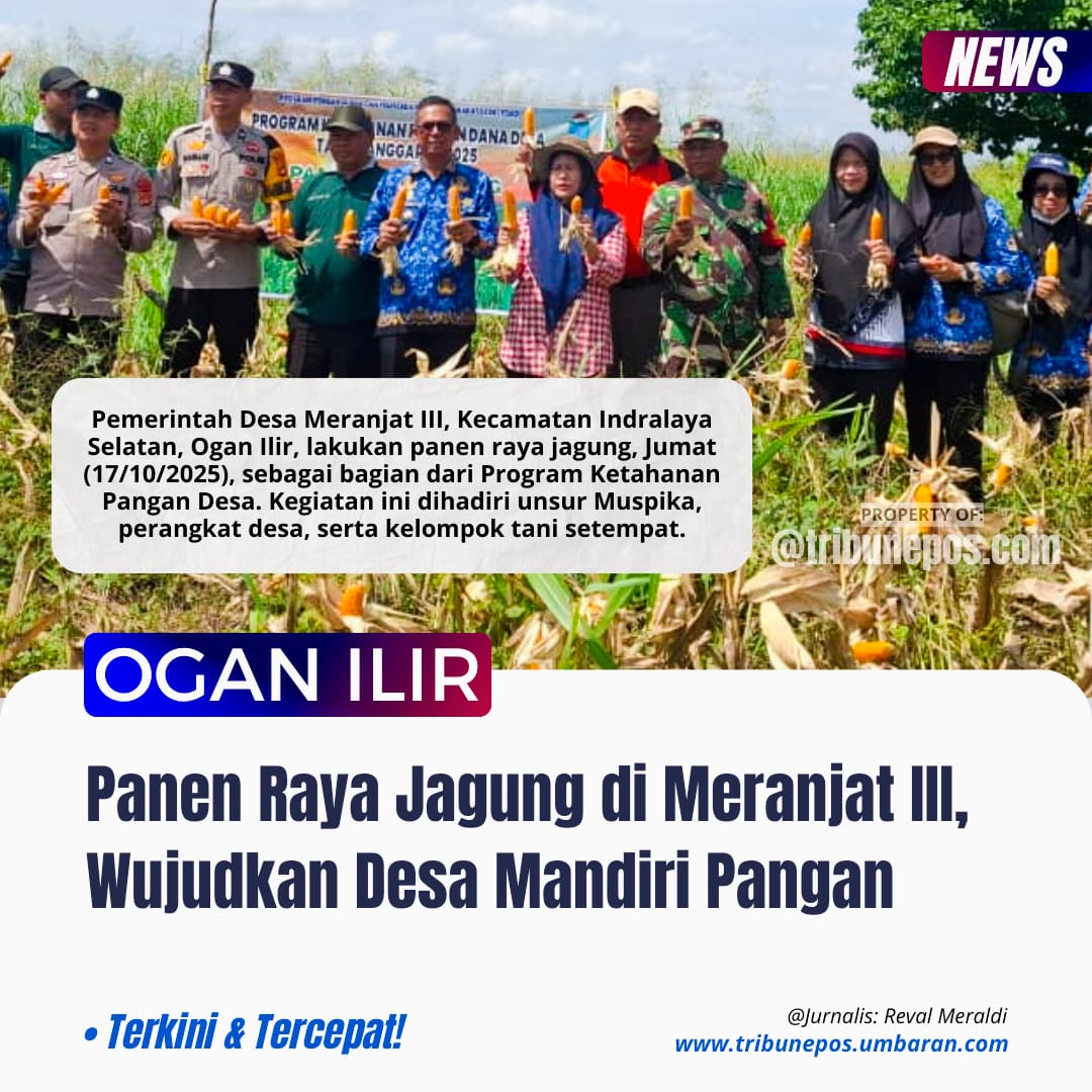 OGAN ILIR, TRIBUNEPOS — Pemerintah Desa Meranjat III, Kecamatan Indralaya Selatan, Ogan Ilir, lakukan panen raya jagung, Jumat (17/10/2025), sebagai bagian dari Program Ketahanan Pangan Desa. Kegiatan ini dihadiri unsur Muspika, perangkat desa, serta kelompok tani setempat.