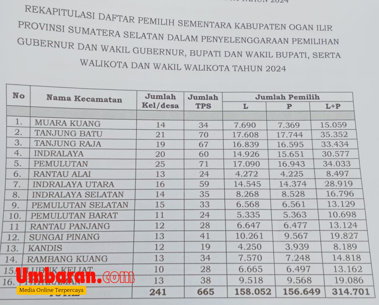 Menurut data yang dirilis, total jumlah pemilih sementara di Kabupaten Ogan Ilir mencapai 314.701 orang.