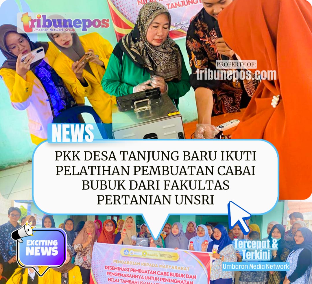 OGAN ILIR, TRIBUNEPOS — Ibu-ibu PKK Desa Tanjung Baru mengikuti kegiatan sosialisasi pembuatan cabai bubuk yang digelar oleh tim Fakultas Pertanian Universitas Sriwijaya (Unsri), Senin (24/11/2025) kemarin.