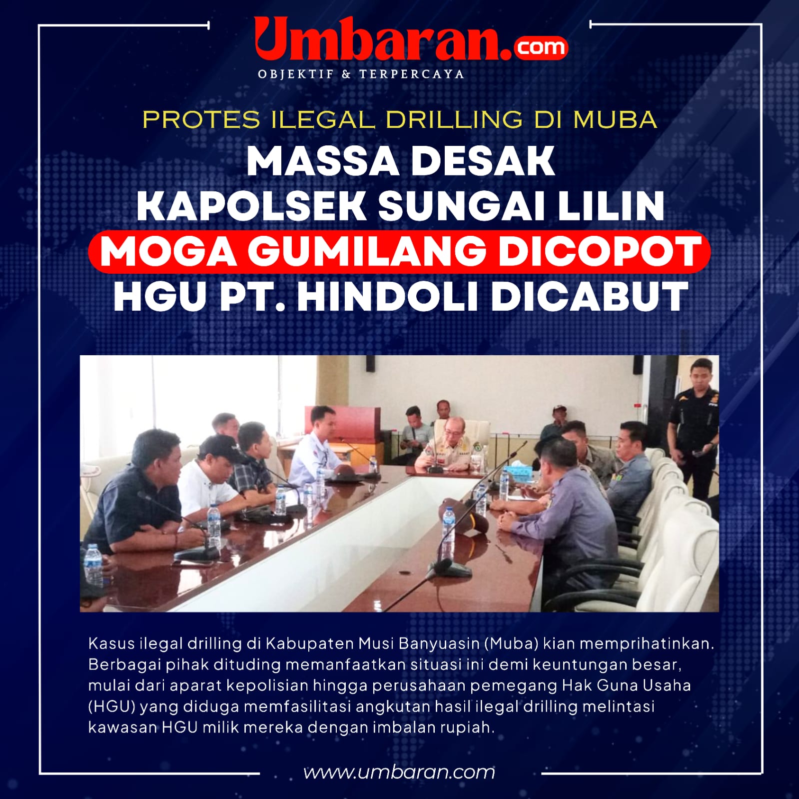Selain itu, Bupati Muba juga didesak segera mencabut HGU PT. Hindoli yang diduga memfasilitasi pelaku ilegal drilling dalam mengangkut hasil minyak melalui jalan perusahaan.