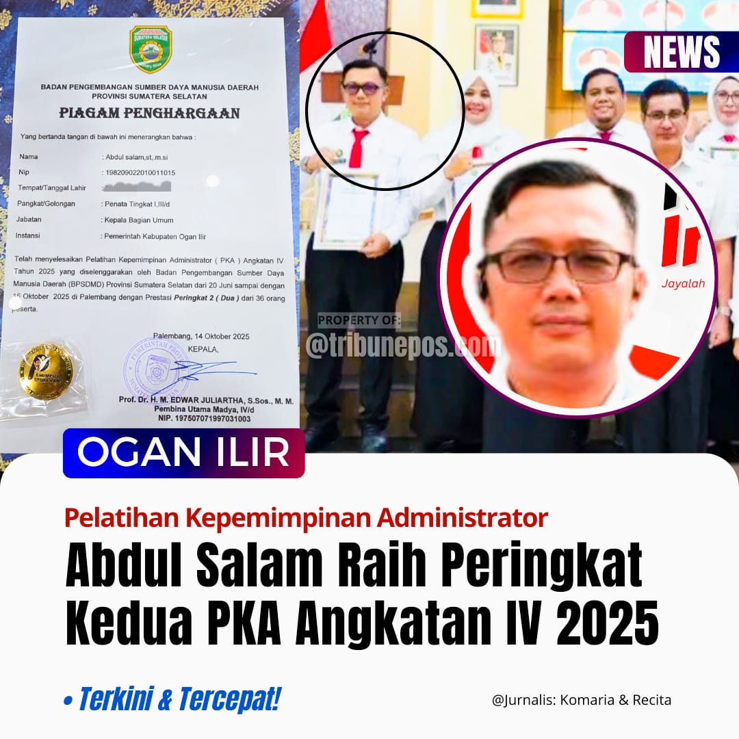 PALEMBANG, TRIBUNEPOS — Prestasi membanggakan kembali diraih oleh aparatur sipil negara asal Kabupaten Ogan Ilir. Abdul Salam, ST, MSi, Kepala Bagian Umum Sekretariat Daerah Kabupaten Ogan Ilir, berhasil menorehkan prestasi sebagai peringkat dua dari 36 peserta dalam Pelatihan Kepemimpinan Administrator (PKA) Angkatan IV Tahun 2025 yang diselenggarakan oleh BKPSDM Provinsi Sumatera Selatan di Palembang.
