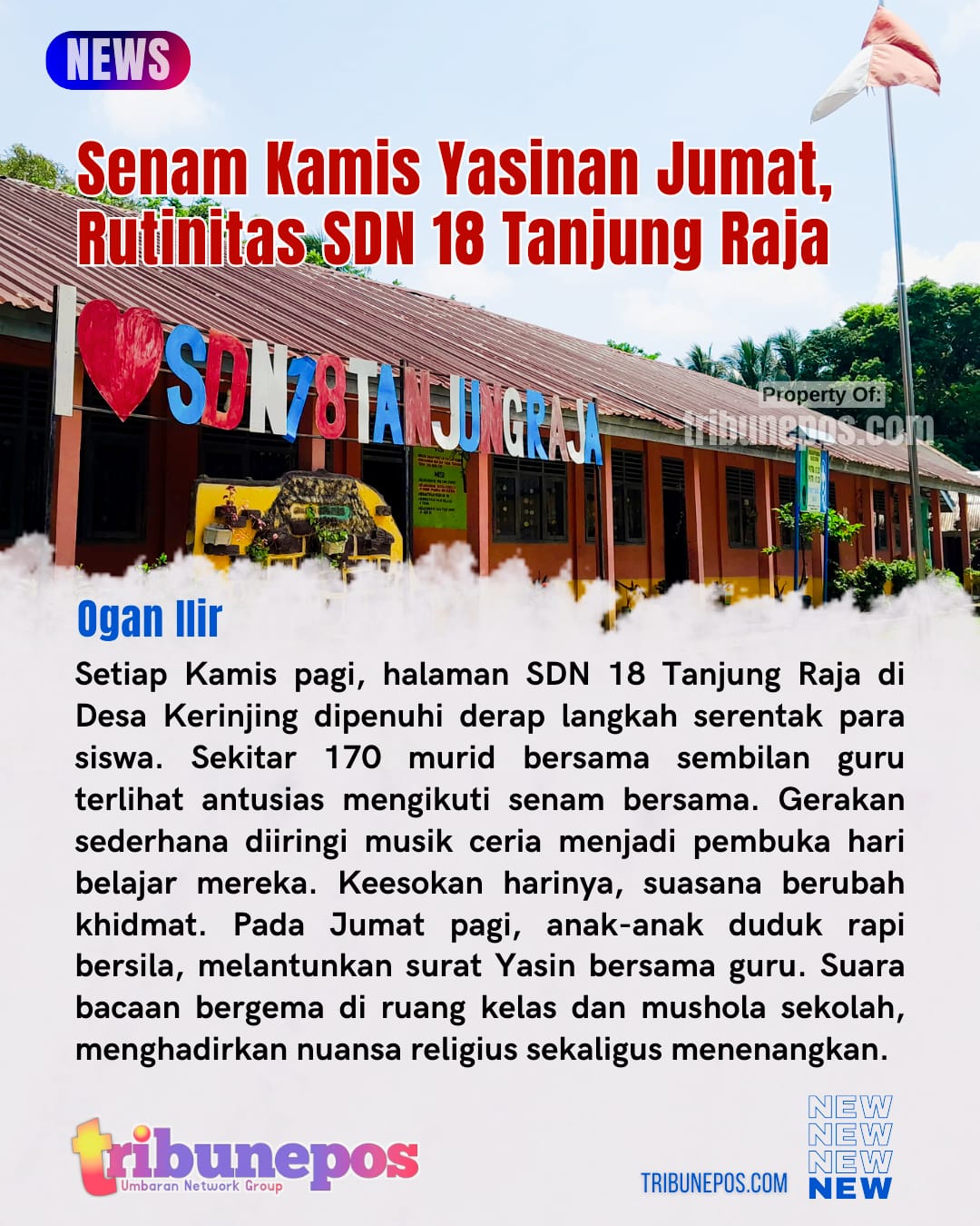 OGAN ILIR, TRIBUNEPOS — Setiap Kamis pagi, halaman SDN 18 Tanjung Raja di Desa Kerinjing dipenuhi derap langkah serentak para siswa. Sekitar 170 murid bersama sembilan guru terlihat antusias mengikuti senam bersama. Gerakan sederhana diiringi musik ceria menjadi pembuka hari belajar mereka.