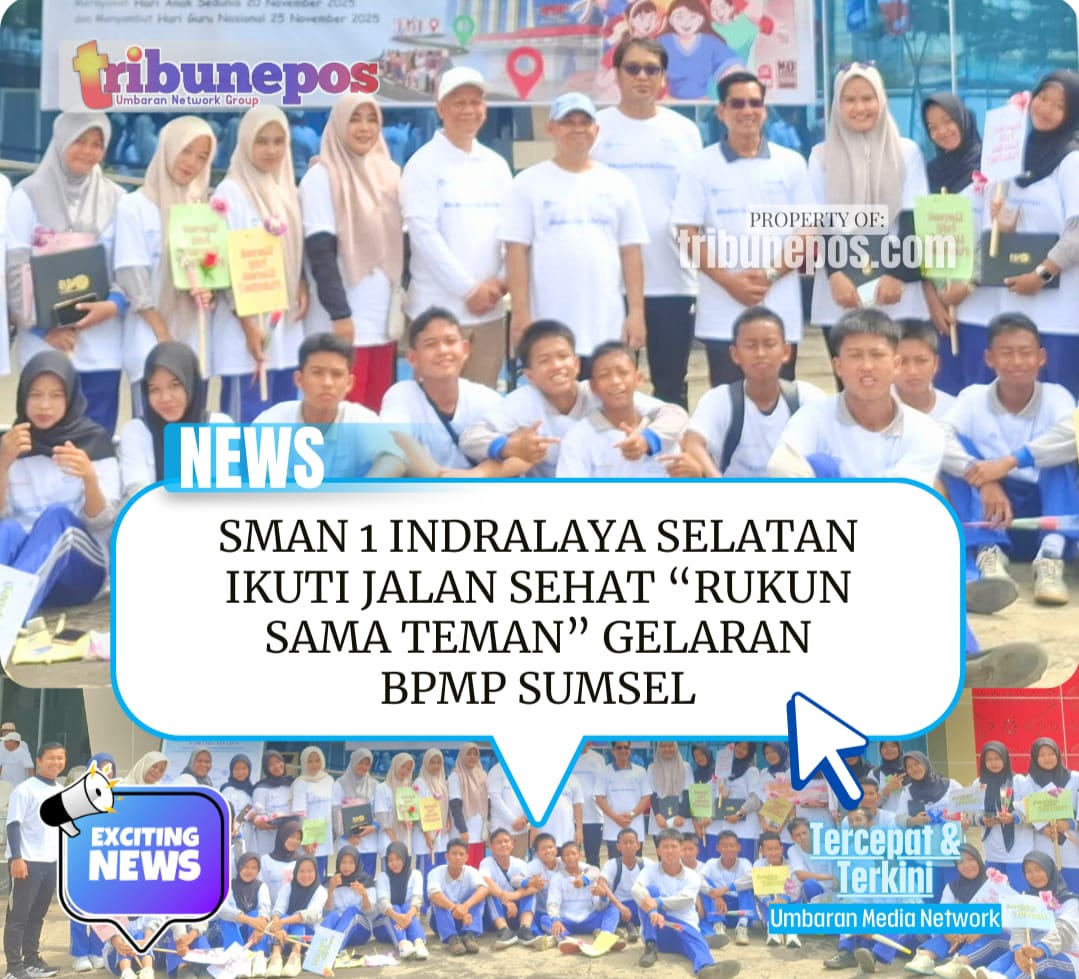 OGAN ILIR, TRIBUNEPOS — SMA Negeri 1 Indralaya Selatan ambil bagian dalam kegiatan jalan sehat bertema “Rukun Sama Teman” yang diselenggarakan Badan Pengembangan Mutu Pendidikan (BPMP) Sumatera Selatan pada Minggu (23/11/2025) kemarin.
