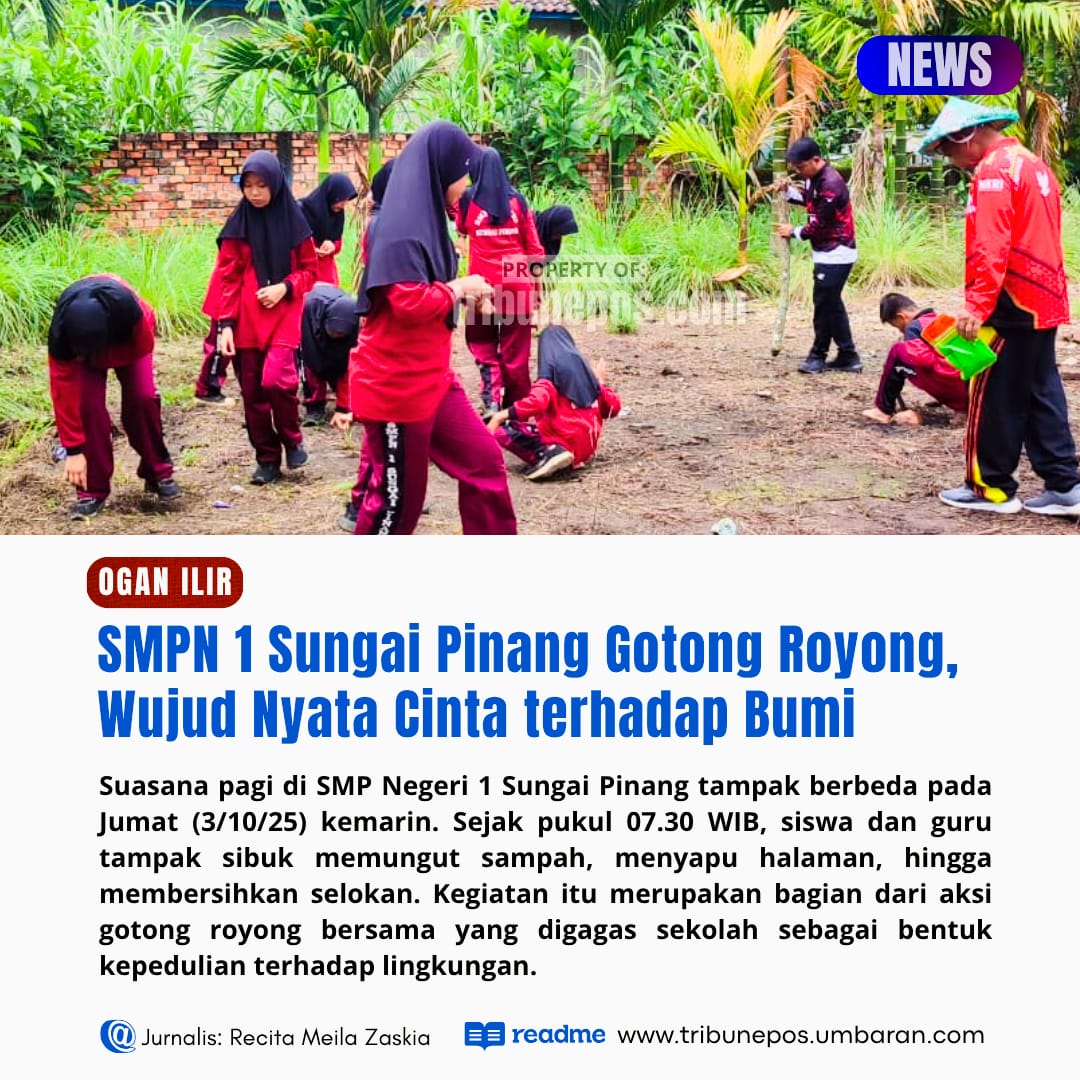 OGAN ILIR, TRIBUNEPOS — Suasana pagi di SMP Negeri 1 Sungai Pinang tampak berbeda pada Jumat (3/10/25) kemarin. Sejak pukul 07.30 WIB, siswa dan guru tampak sibuk memungut sampah, menyapu halaman, hingga membersihkan selokan.