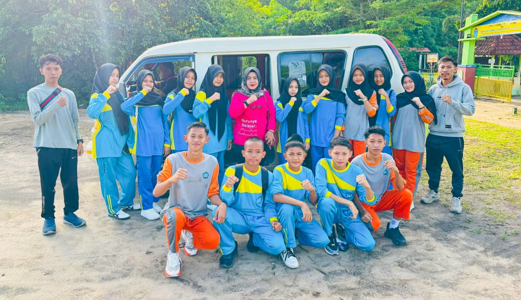 Rombongan yang terdiri atas guru, siswa, dan tenaga kependidikan tampak kompak mengenakan pakaian olahraga seragam, memancarkan semangat kebersamaan.