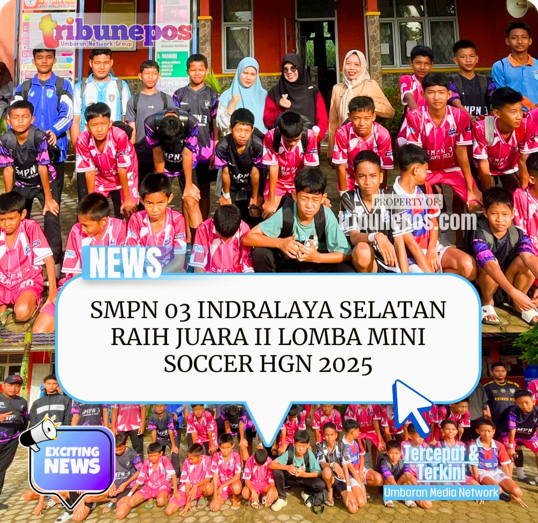OGAN ILIR, TRIBUNEPOS — SMPN 3 Indralaya Selatan mencatat prestasi membanggakan dengan meraih juara II pada lomba mini soccer antar pelajar se-Kecamatan Indralaya Selatan yang digelar di SDN 04 Indralaya Selatan, Kamis (20/11/2025) lalu. Kegiatan ini menjadi bagian dari rangkaian perayaan Hari Guru Nasional (HGN) 2025.