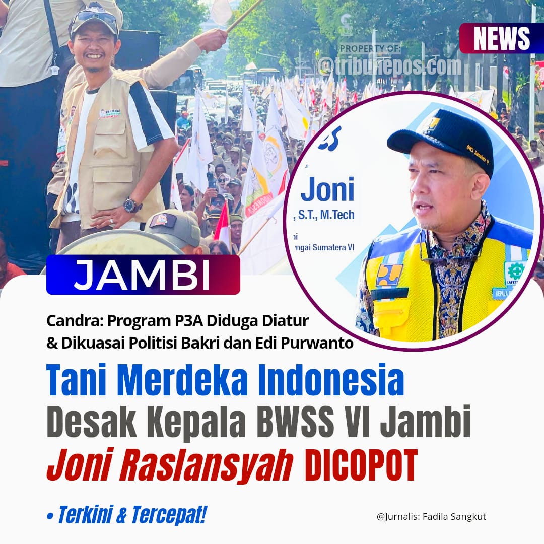 JAMBI, TRIBUNEPOS — Dewan Pimpinan Wilayah (DPW) Tani Merdeka Indonesia Provinsi Jambi mendesak Kementerian PUPR segera mengganti Kepala Balai Wilayah Sungai Sumatera (BWSS) VI Jambi, Joni Raslansyah.