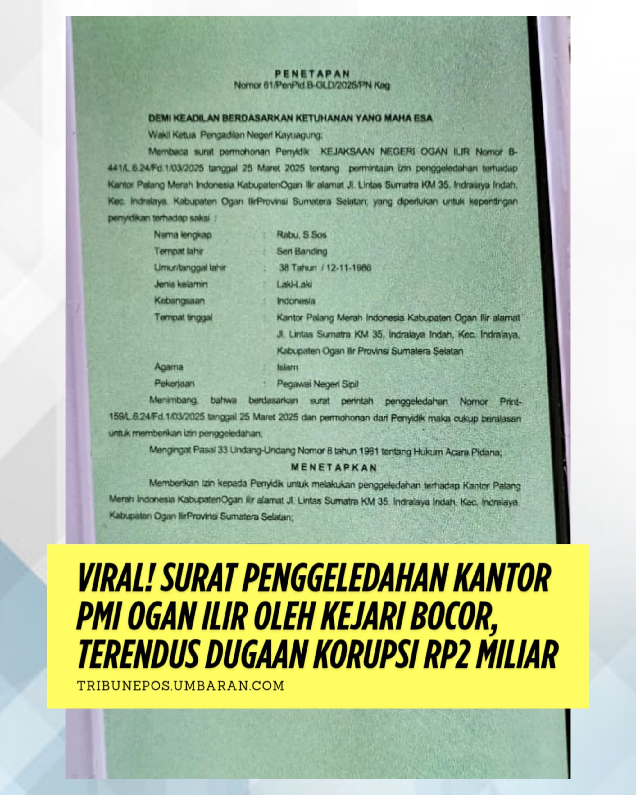 TRIBUNEPOS – Sebuah surat penggeledahan yang ditandatangani secara elektronik oleh Pengadilan Negeri OKI, atas permintaan Kejaksaan Negeri Ogan Ilir, mendadak viral di media sosial.