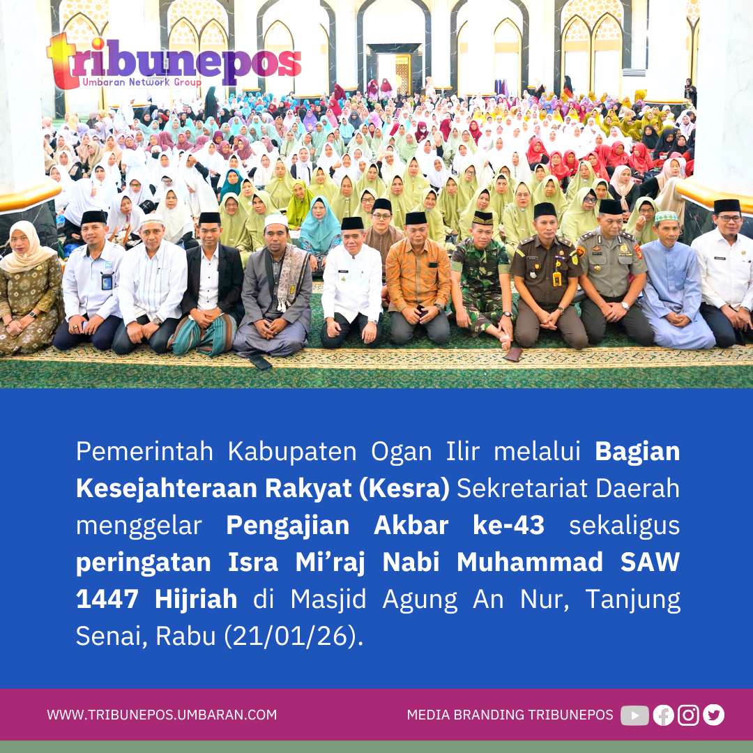 OGAN ILIR, TRIBUNEPOS.COM — Pemerintah Kabupaten Ogan Ilir melalui Bagian Kesejahteraan Rakyat (Kesra) Sekretariat Daerah menggelar Pengajian Akbar ke-43 sekaligus peringatan Isra Mi’raj Nabi Muhammad SAW 1447 Hijriah di Masjid Agung An Nur, Tanjung Senai, Rabu (21/01/26).