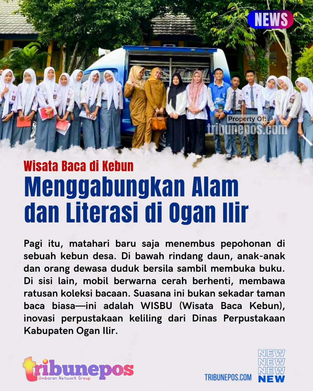 OGAN ILIR, TRIBUNEPOS — Pagi itu, matahari baru saja menembus pepohonan di sebuah kebun desa. Di bawah rindang daun, anak-anak dan orang dewasa duduk bersila sambil membuka buku. Di sisi lain, mobil berwarna cerah berhenti, membawa ratusan koleksi bacaan.